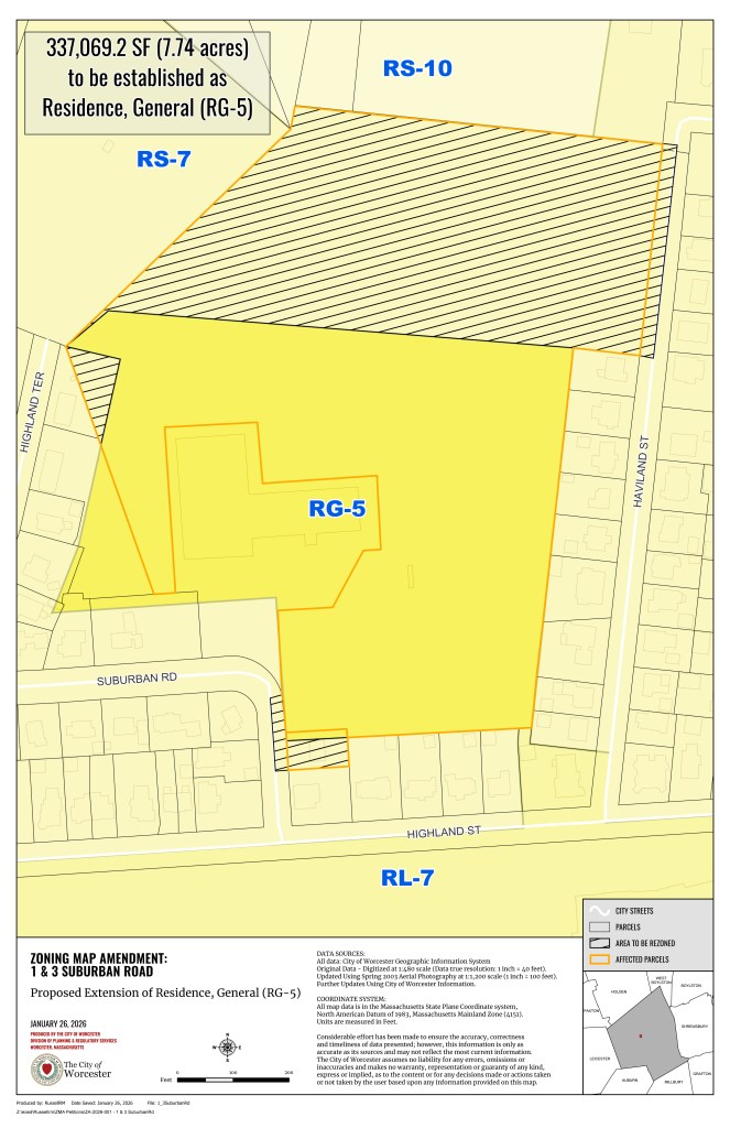For those who are unfamiliar with the situation, a petition to upzone the 7 3/4 northern chunk of the 3 Suburban Road parcel to RG-5 was recommended by the Worcester planning board on February 18th. The developer, who does not yet own the land, has proposed the upzone as a way to avoid building on the whole property, as it gives them the ability to more densely pack dwelling units in the southern end of the property. The problem with this claim is that once the upzone is granted, we have no way of being sure that they won’t densely build the ENTIRE 16.5 acres of land.
