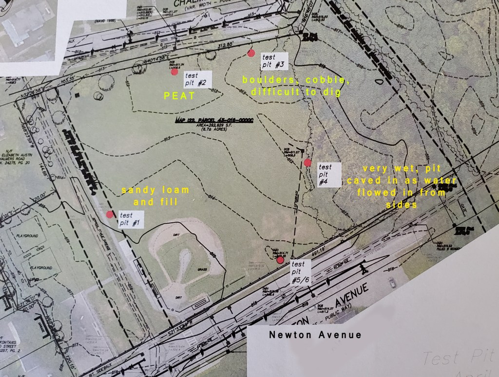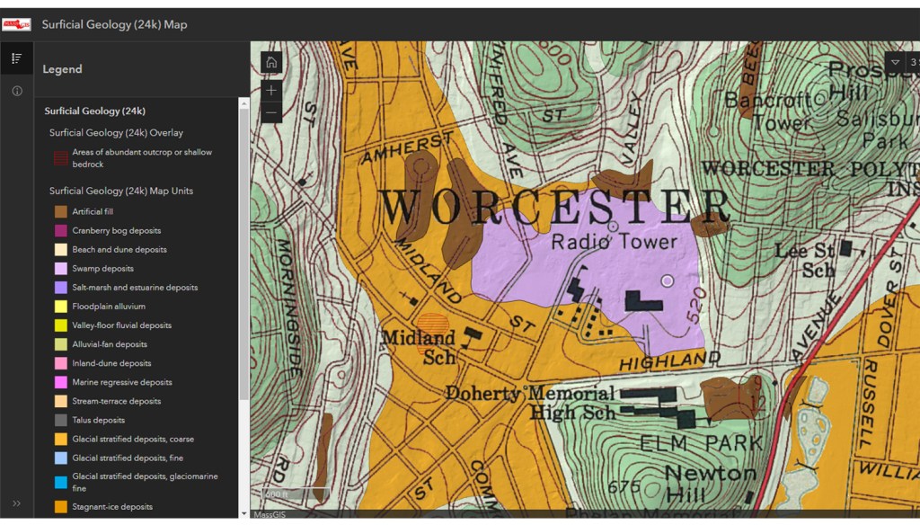 First of all, we know the site’s history as a peatlands which are a form of wetlands. We have two recent geotechnical surveys, one from Duffy Field to the west and one from the Haviland St side to the east that both show the presence of damp or wet peat and high groundwater. We can guess about what’s happening in between, but we can make that guess more valid using USGS maps that show swamp deposits and a “low yield” aquifer through the whole property.